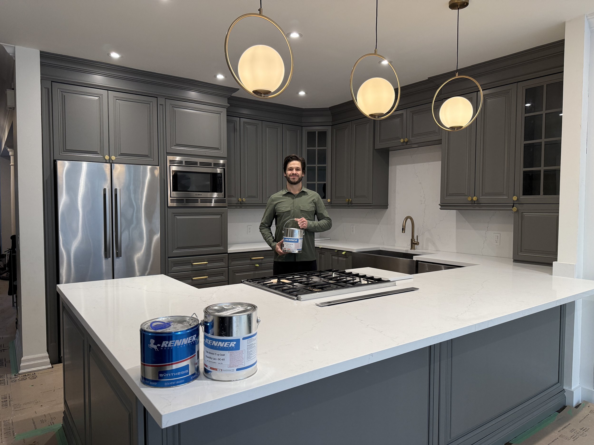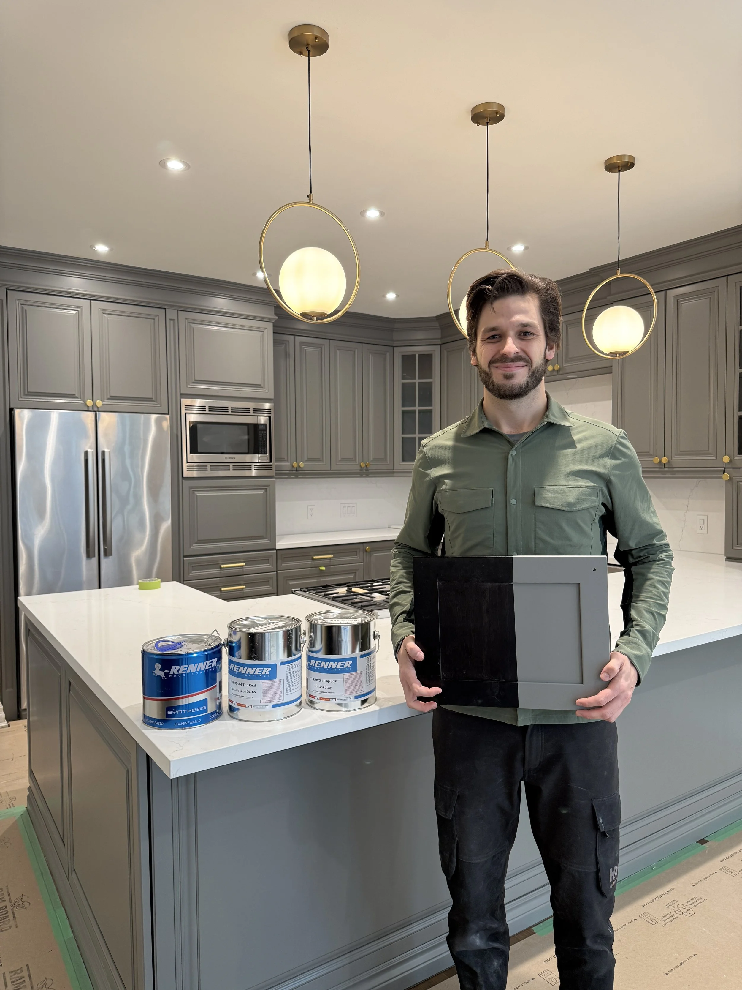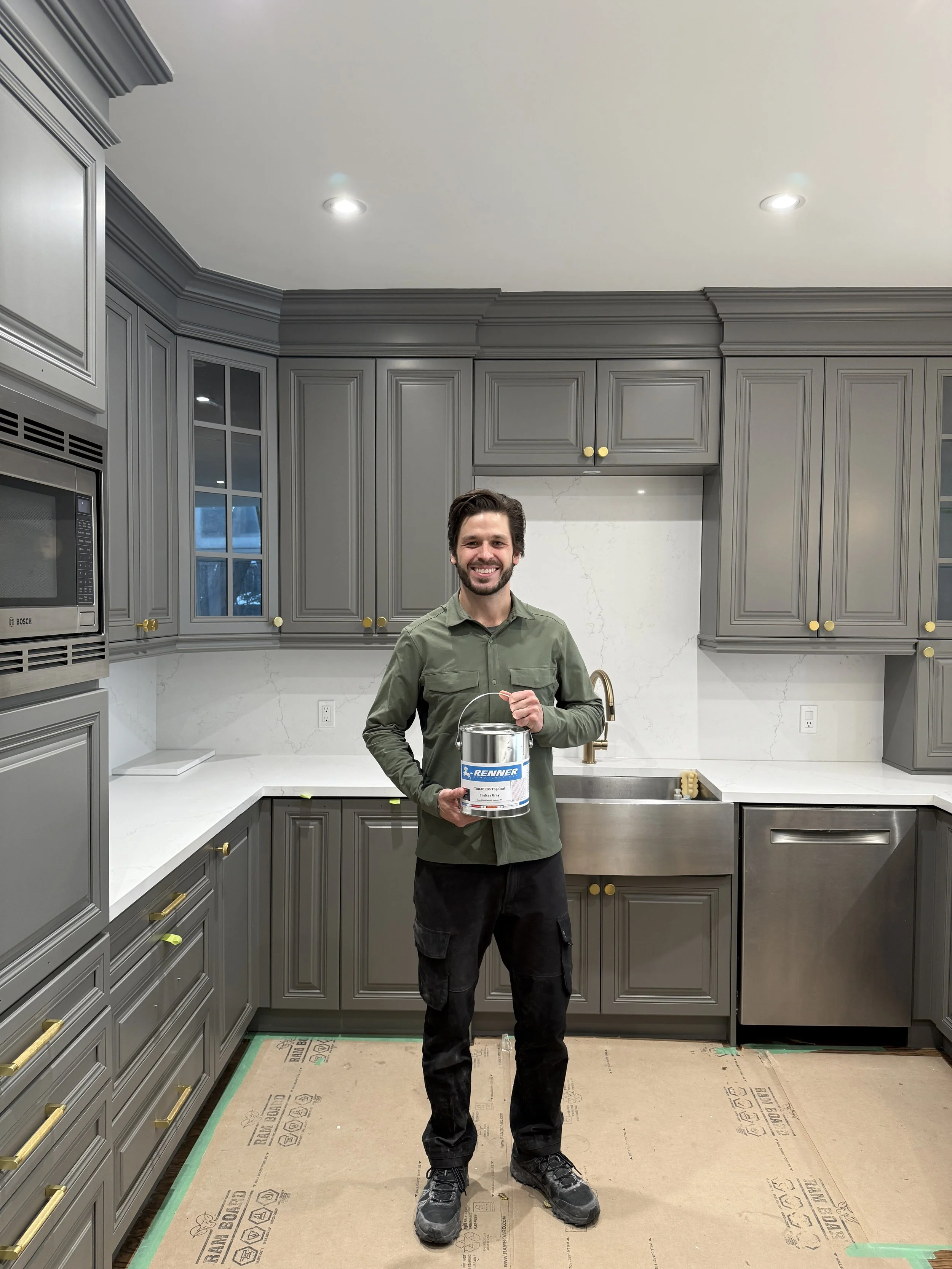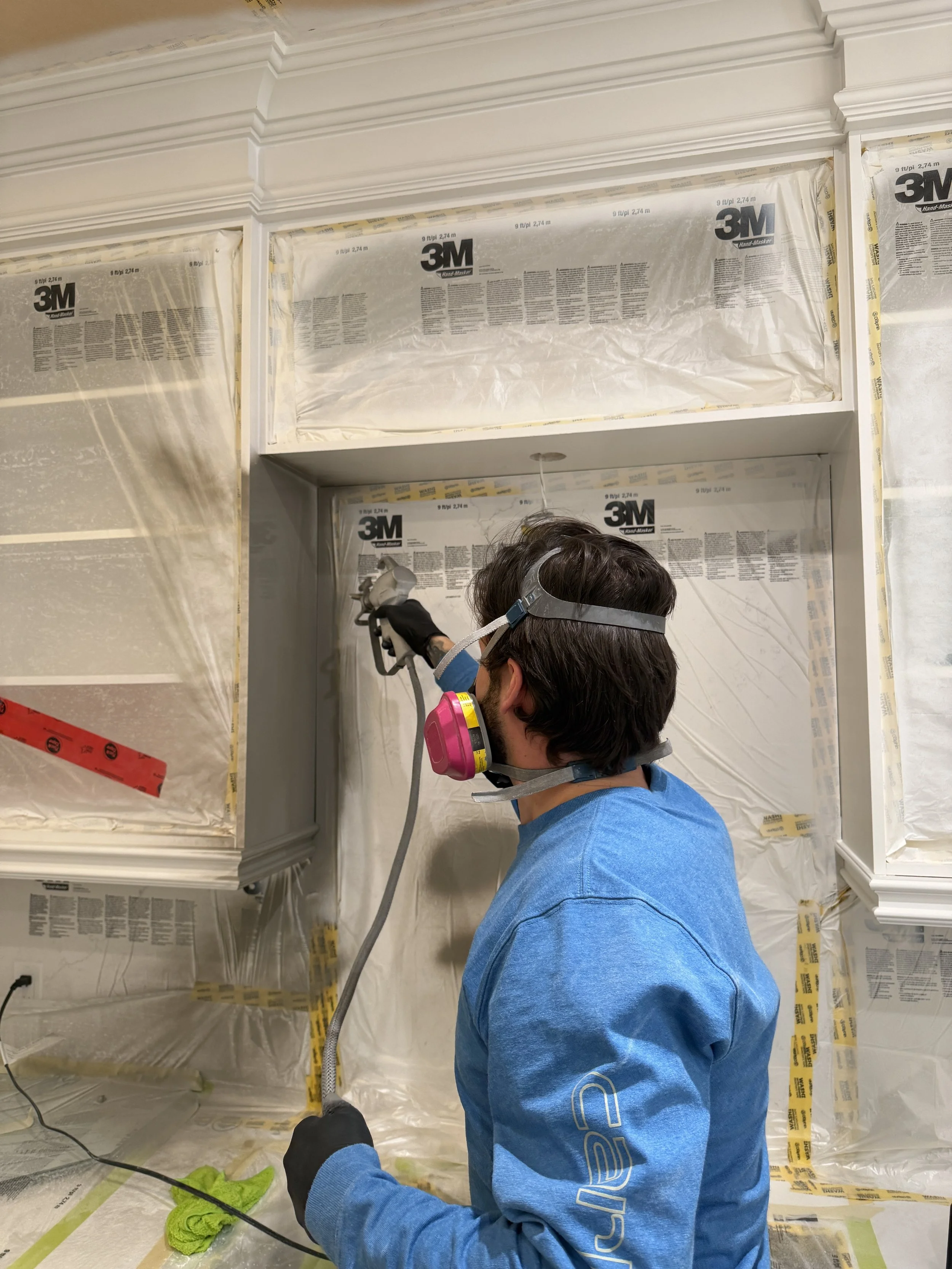 Spraying cabinets on-site allows for greater control over fit, finish, and consistency while avoiding the added cost and risk associated with transporting cabinetry. By eliminating the overhead of an off-site spray facility, I’m able to pass those savings directly on to the client—without compromising quality. Cabinet doors and boxes receive the same level of finish on-site, resulting in a more seamless and refined final product.