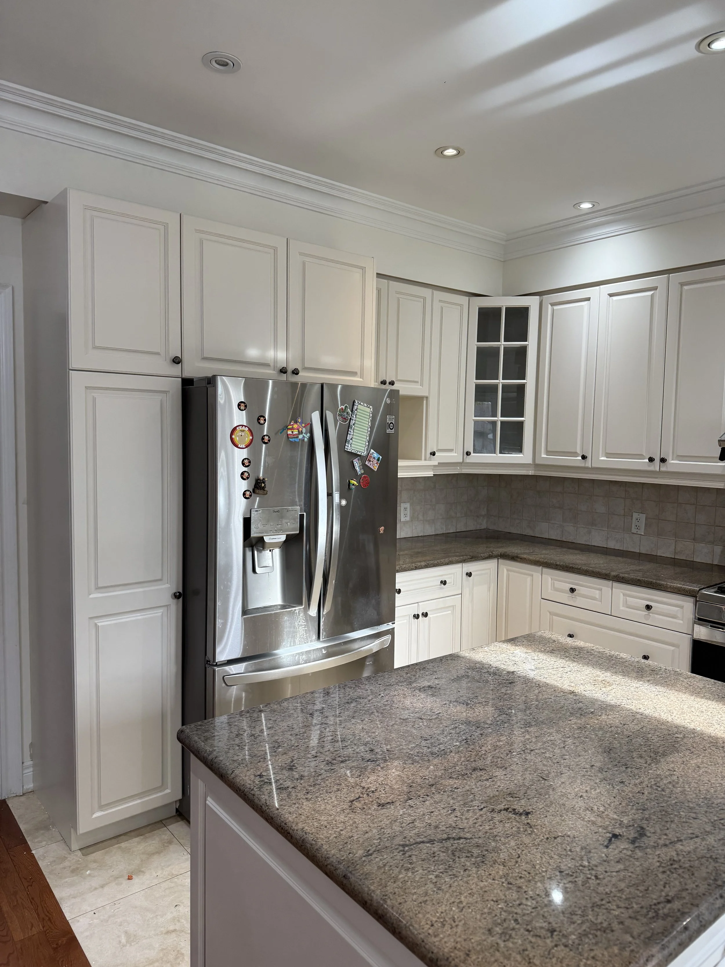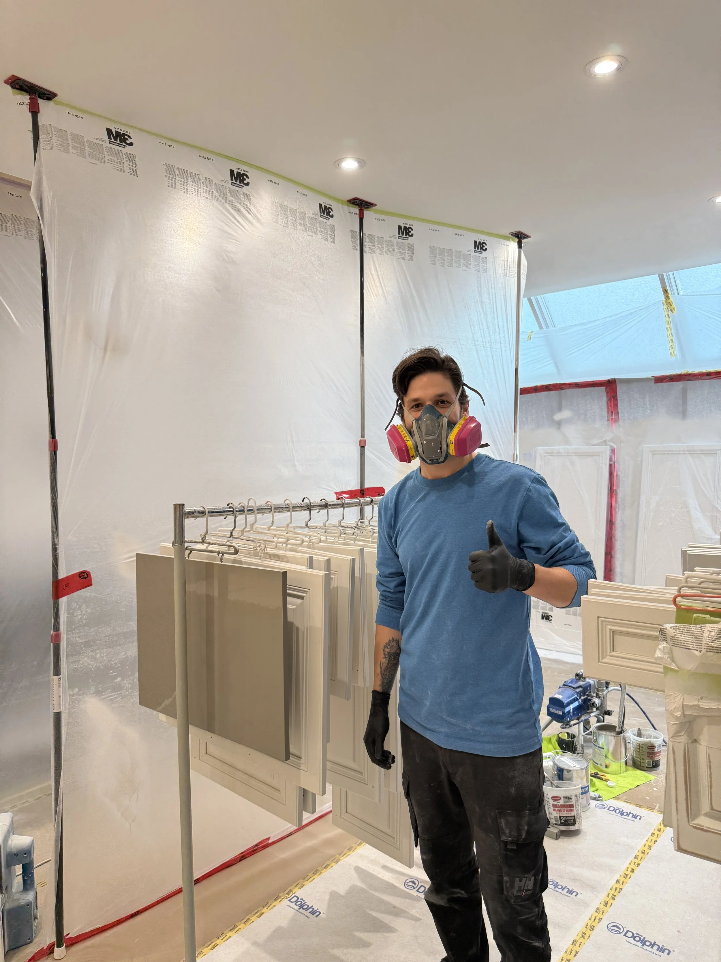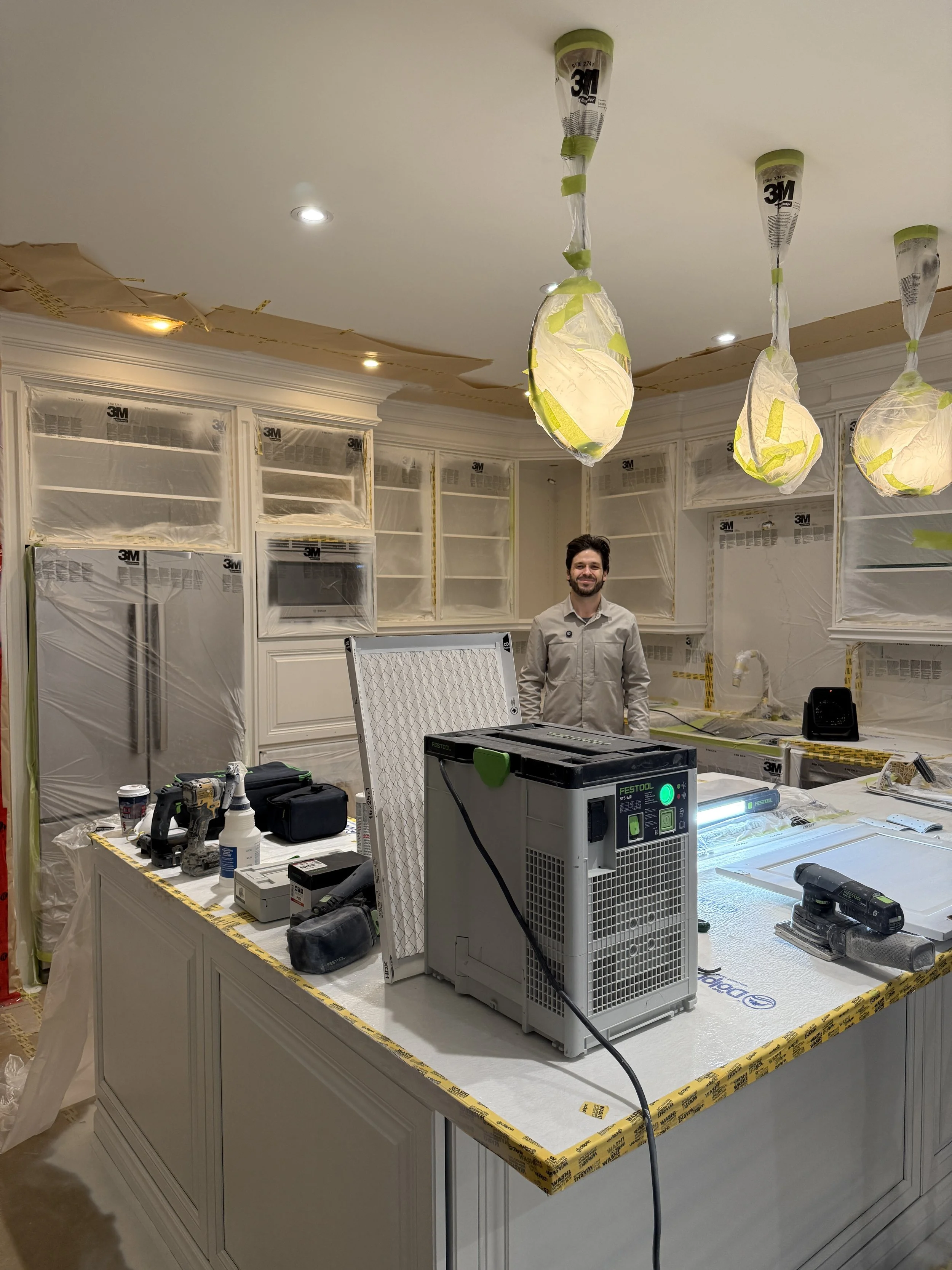 Overspray protection is a top priority. I build a temporary spray booth inside your home with proper ventilation and use multiple air scrubbers to continuously clean the air while I work. All surrounding surfaces are carefully masked and protected, ensuring that paint is contained to the cabinets only. This controlled process allows me to deliver a factory-quality finish without compromising your home’s cleanliness or safety, leaving the space spotless once the project is complete.
